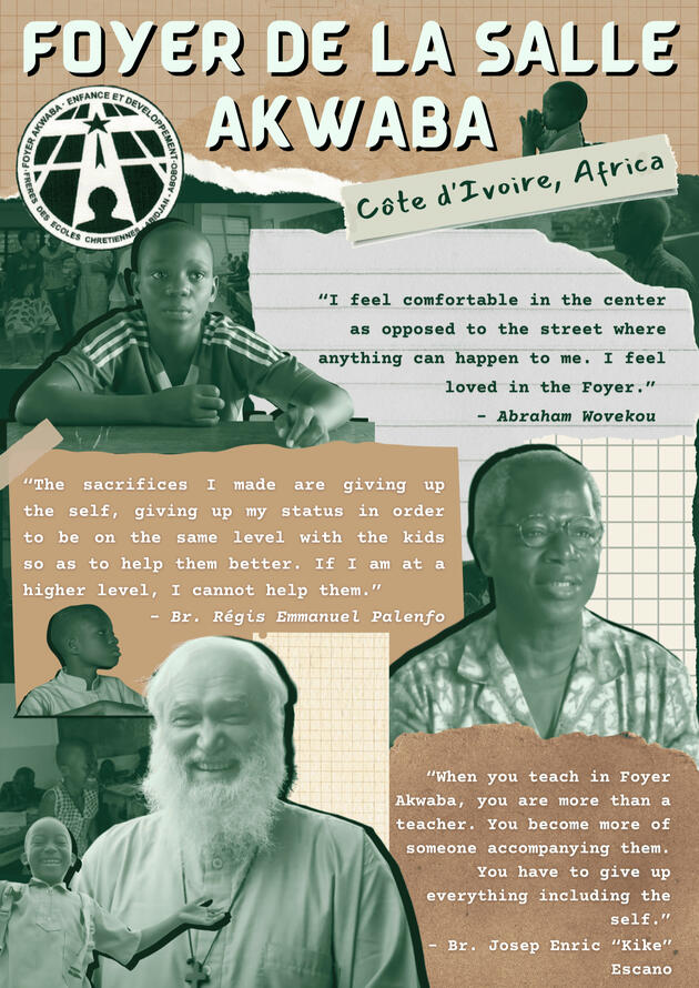 Greetings in St. La Salle!Welcome to our presentation of the Lasallian story! We strive to embody the Lasallian values and virtues in our everyday lives, hoping to pass along the knowledge that we have learned unto others. From our current status as students towards our future professions, we bring with us our experience and guidance bestowed upon by the Lasallian community to give service to those in need similar to the stories told by our Lasallian Brothers and sisters.The chosen Lasallian story was one set in Côte d Ivoire, Africa. The Foyer De La Salle Akwaba. The concern for the youth in abusive environments and service to rediscover the children’s human dignity touched our hearts, and really displayed what being a Lasallian is. Their stories of sacrifice and service have inspired our group to create not one creative work but two pieces that embraced the efforts of the Lasallian community in Akwaba.Continue on to view the creative pieces created by the group!